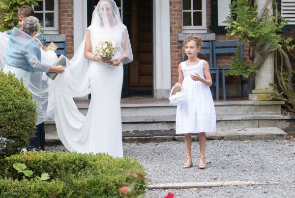 Leuk is het om ook al de bruidsmeisjes met eenzelfde bloemenkroon te zien. Niet alleen één van wit gipskruid, maar ook bijvoorbeeld met oranje of geel of een andere vrolijke kleur die in de outfit voorkomt.